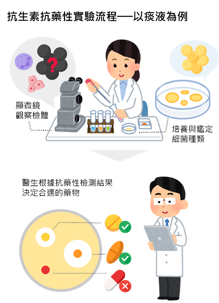 假如細菌感染,要如何知道哪一種抗生素有效?在醫院,一次完整的抗生素檢驗包含多個重要步驟。以檢驗痰液中細菌的抗藥性為例,首先會進行顯微鏡檢查,初步觀察檢體(痰液)中是否有細胞 (如上皮細胞)、白血球或細菌等等,此時雖然能觀察到細菌的特徵,但還不能確認種類,因此同時會將檢體中的細菌進行培養與鑑定,在確認細菌種類後,才能進一步測試它對各種抗生素的反應,也就是抗藥性檢測。醫師會根據這些結果,選擇對病患最有效、最合適的抗生素進行治療。(圖二)