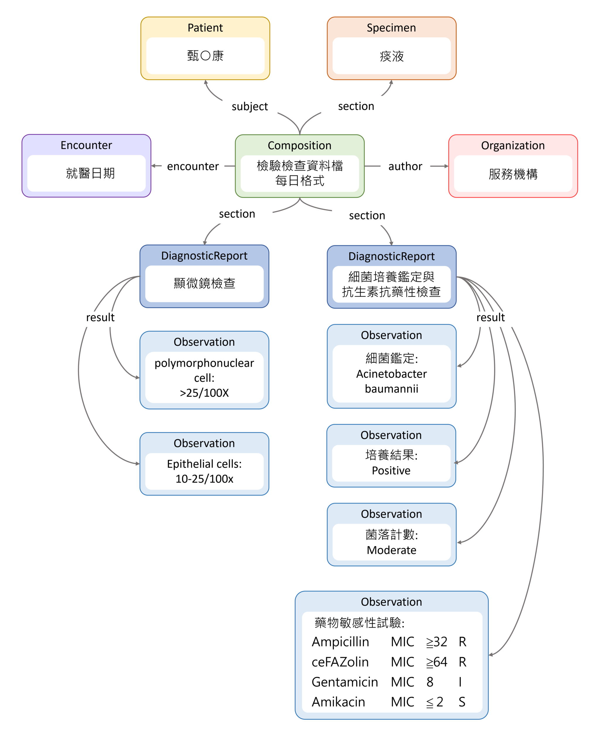 本範例提供模擬的抗生素抗藥性檢驗檢查報告、架構圖、JSON檔案以及常用病原體的SNOMED CT(Systematized Nomenclature of Medicine — Clinical Terms)代碼表。檢驗報告內容涵蓋顯微鏡檢查、細菌培養與鑑定,以及抗生素抗藥性檢測三大部分;架構圖幫助讀者理解檢驗資料轉換成 FHIR 格式的結構;驗證成功的 JSON 檔案,呈現最詳細、完整的資料內容;最後,SNOMED CT病原體代碼表完整包含了常見細菌,減少查找代碼的時間。所有範例皆經感染症專家與 FHIR 專家審核,將複雜的細菌與抗生素抗藥性資訊,以更清楚、易懂的方式呈現,為臨床醫療與研究應用打下良好的基礎。