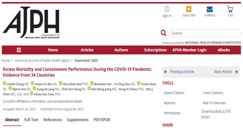 我們的文章 “Excess Mortality and Containment Performance During COVID-19 Pandemic: Evidence from 34 Countries“獲得 <American Public Health Association (美國公衛學會)>選為精選文章