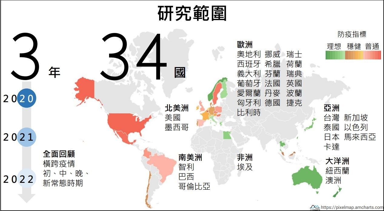 國衛院研究團隊與防疫專家之前已於2022年在國際期刊Scientific Reports上發表了一套有實證基礎的「防疫指標」,涵蓋政府政策、民眾健康識能、身心健康與社會經濟影響等十大面向,能更全面地評估各國防疫成效。「防疫指標」的總分越高,表示該國在十大面向的綜合表現越好。此評估指標,目的在於呈現有效控制疫情的同時,也把對社會經濟的傷害降至最低。本次研究則是選擇有完整資料且橫跨三年的34個國家,使用該「防疫指標」比較不同的防疫表現對於三年期間超額死亡的影響。