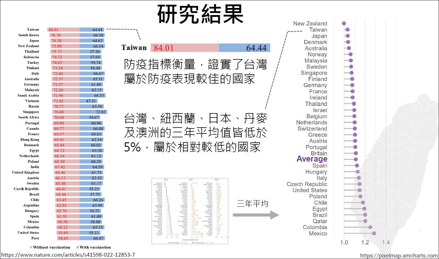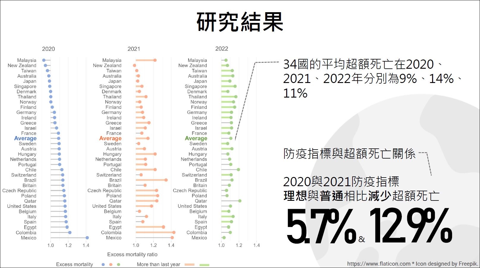 研究結果顯示,34國的平均超額死亡率在2020、2021、2022年分別為9%、14%、11%。其中,防疫指標分數高的國家相較於防疫指標分數低的國家,在2020年及2021年超額死亡率分別顯著降低了5.7%和12.9% (亦即每一千人中減少死亡57人或129人)。跨國研究結果也顯示,疫情初期政府果斷採取嚴格防控措施,能帶來長期益處,有效降低傳播與死亡。